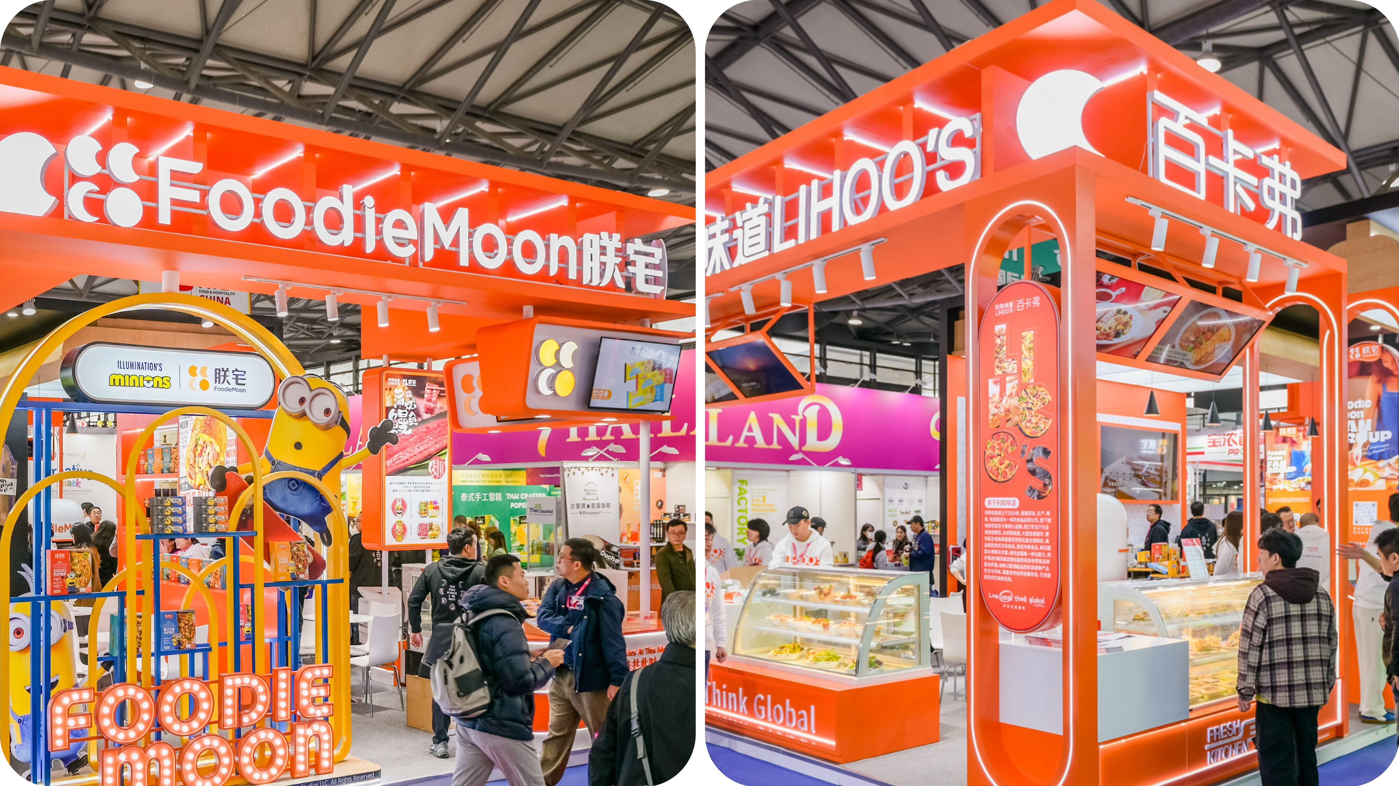 在展台设计上,利和味道巧妙地讲述了品牌故事。“朕宅”标志性的“四个月亮”视觉指引着观众,步入一个融合了家庭厨房场景,现场设置的窑炉大烤箱正烘烤着“朕宅”新推出的小黄人联名薄饼,旁侧呈现蓝黄相间的圆拱门与穿梭其间的小黄人,“FoodieMoon”品牌元素巧妙点缀,香气构成了最直接的感官链接。