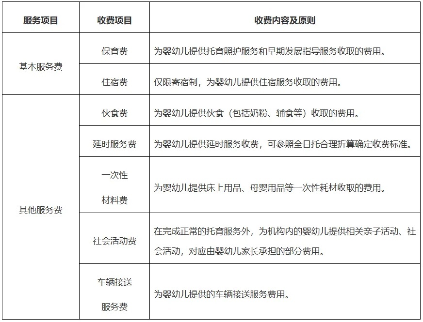 普惠托育服务机构收费包括基本服务费和其他服务费。其中,基本服务费包括保育费、住宿费(仅限寄宿制);其他服务费指在基本服务费外,服务机构收取或代收的伙食费、材料费等其他费用。