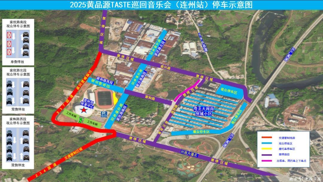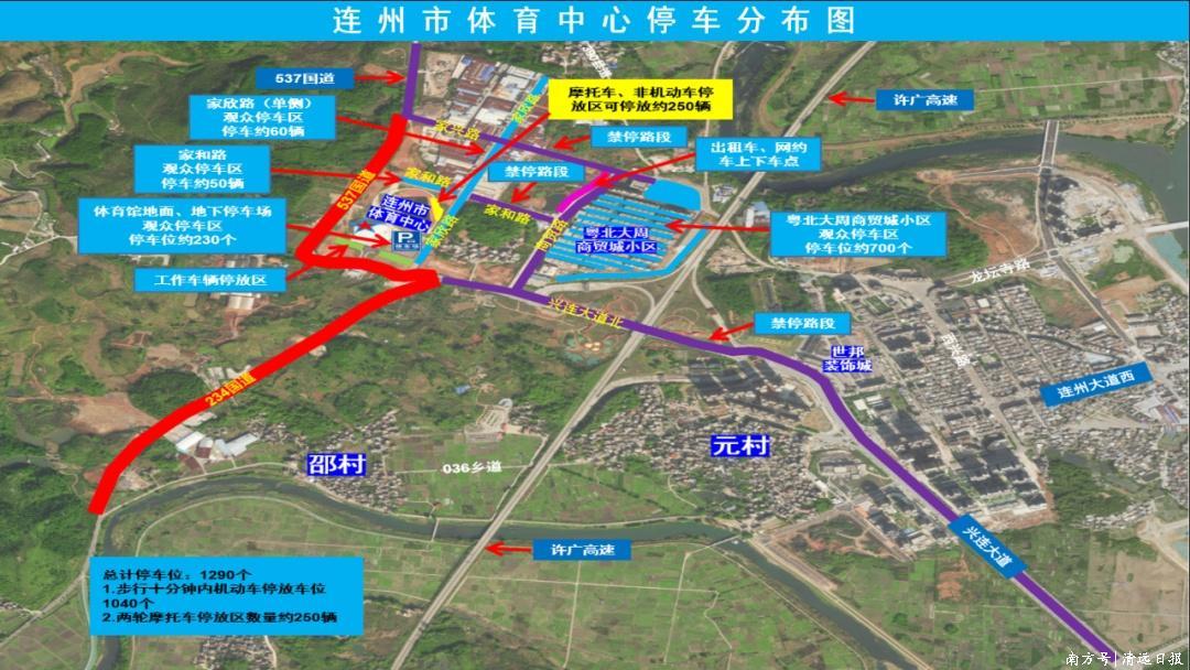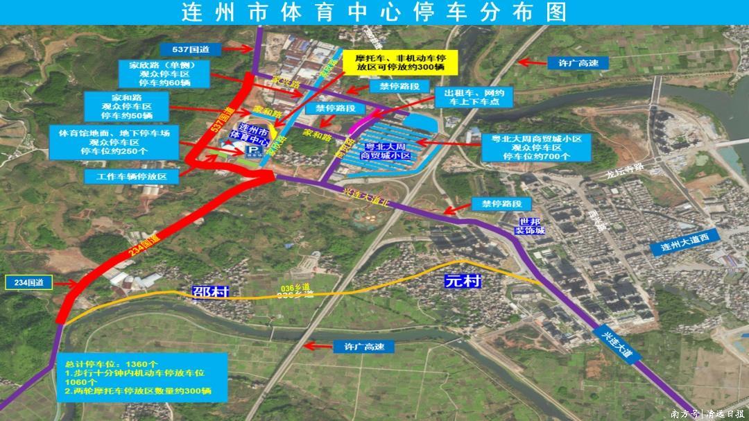 (二)观众摩托车、电动自行车从兴连大道北方向往537国道进入家欣路行驶至连州市体育中心足球场东侧外围道路停放。