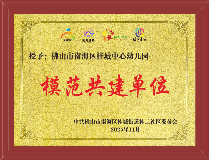 值得一提的是,中共佛山市南海区桂城街道桂二社区委员会在活动中授予桂城中心幼儿园“模范共建单位”称号,充分肯定园所在推动家庭、幼儿园与社区三方联动中的积极贡献。桂城中心幼儿园始终致力于搭建教育共同体桥梁,本次参与社区联合活动,既展示了园所艺术教育成果,也进一步促进了教育资源的共享与互动,让教育在社区中生根,让孩子在爱与陪伴中绽放光彩。