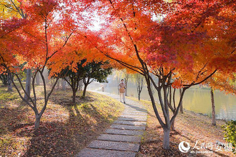 双清湾公园内一处林荫小道,行人从火红的枫林下经过。人民网记者 王晓飞摄