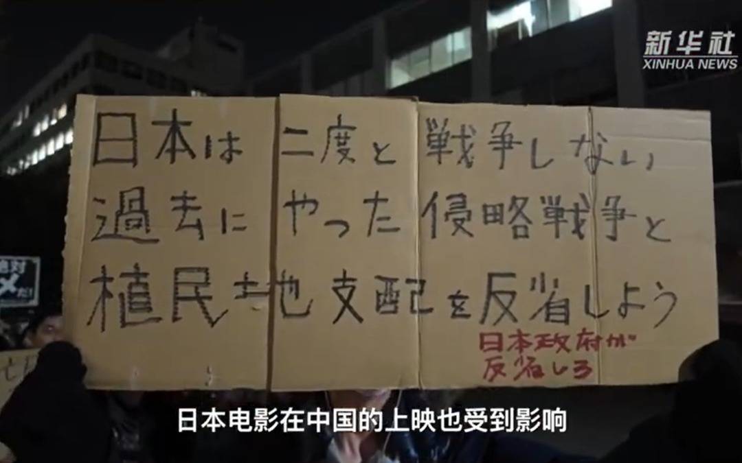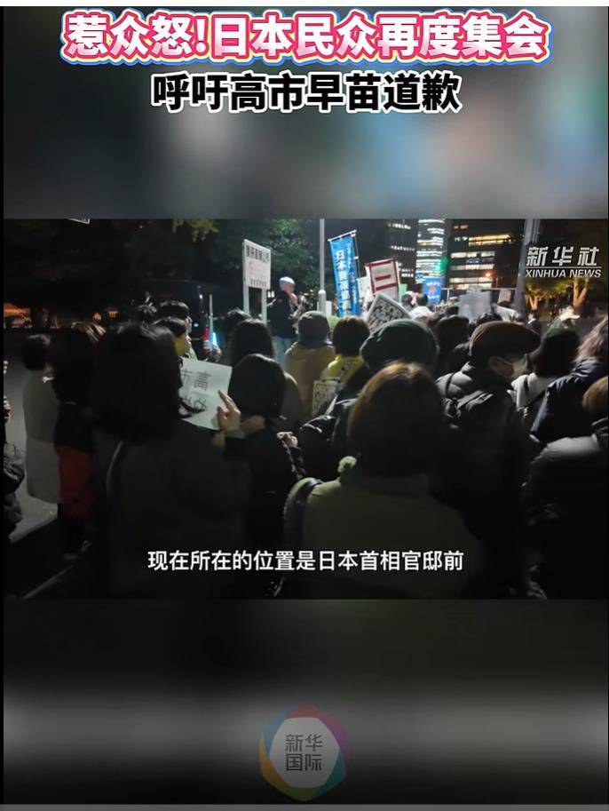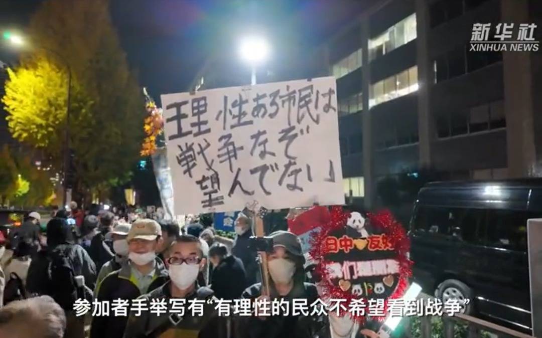 集会定于当地时间20时开始。19时前后,便有民众陆续赶到现场。抗议者们举着写有“撤回言论 反对战争”“因高市才有事”“高市下台”等标语的牌子,高喊“禁止军国主义复燃”等口号。多名抗议者要求高市对其涉台言论负责并辞去首相职务。