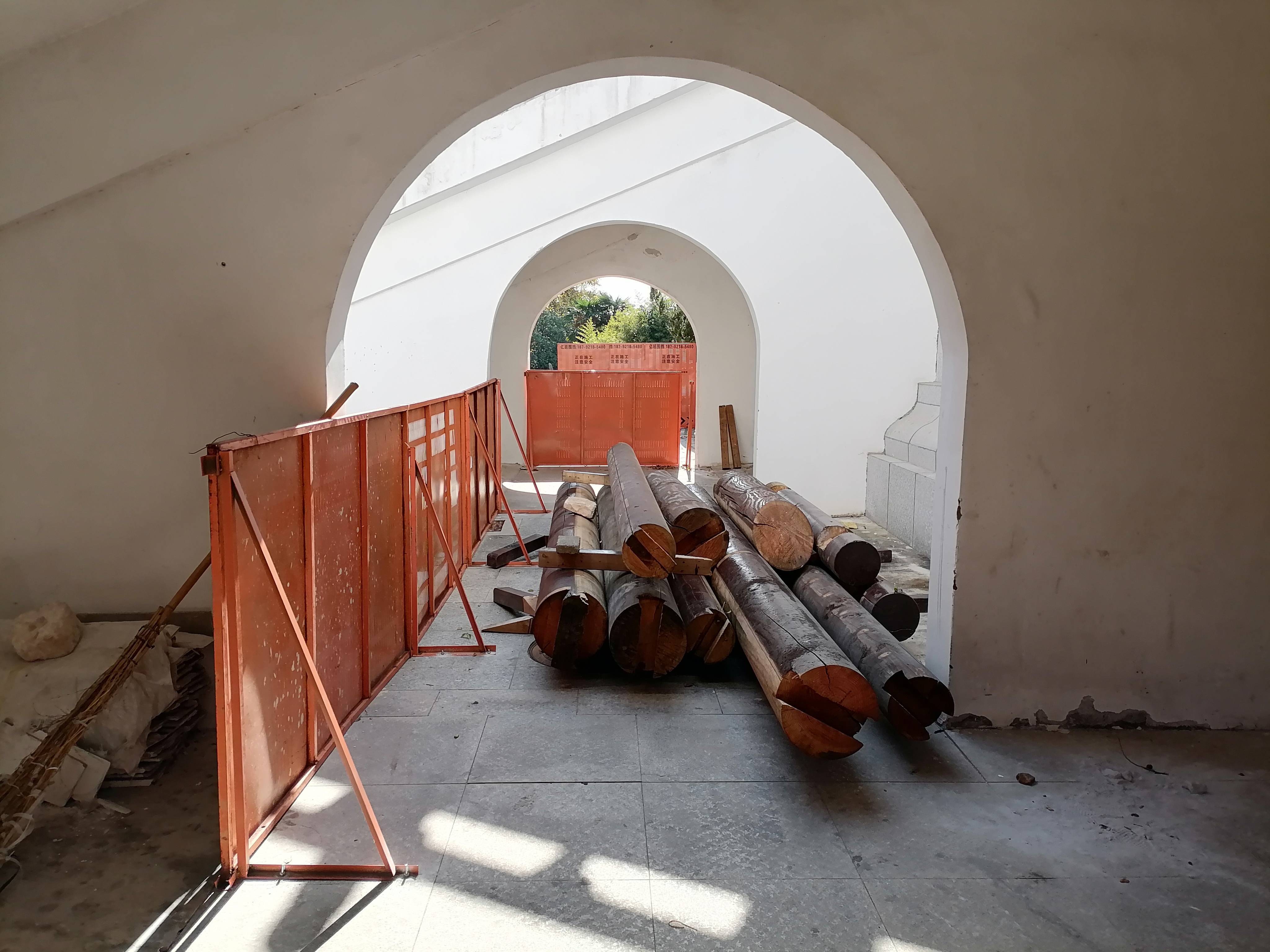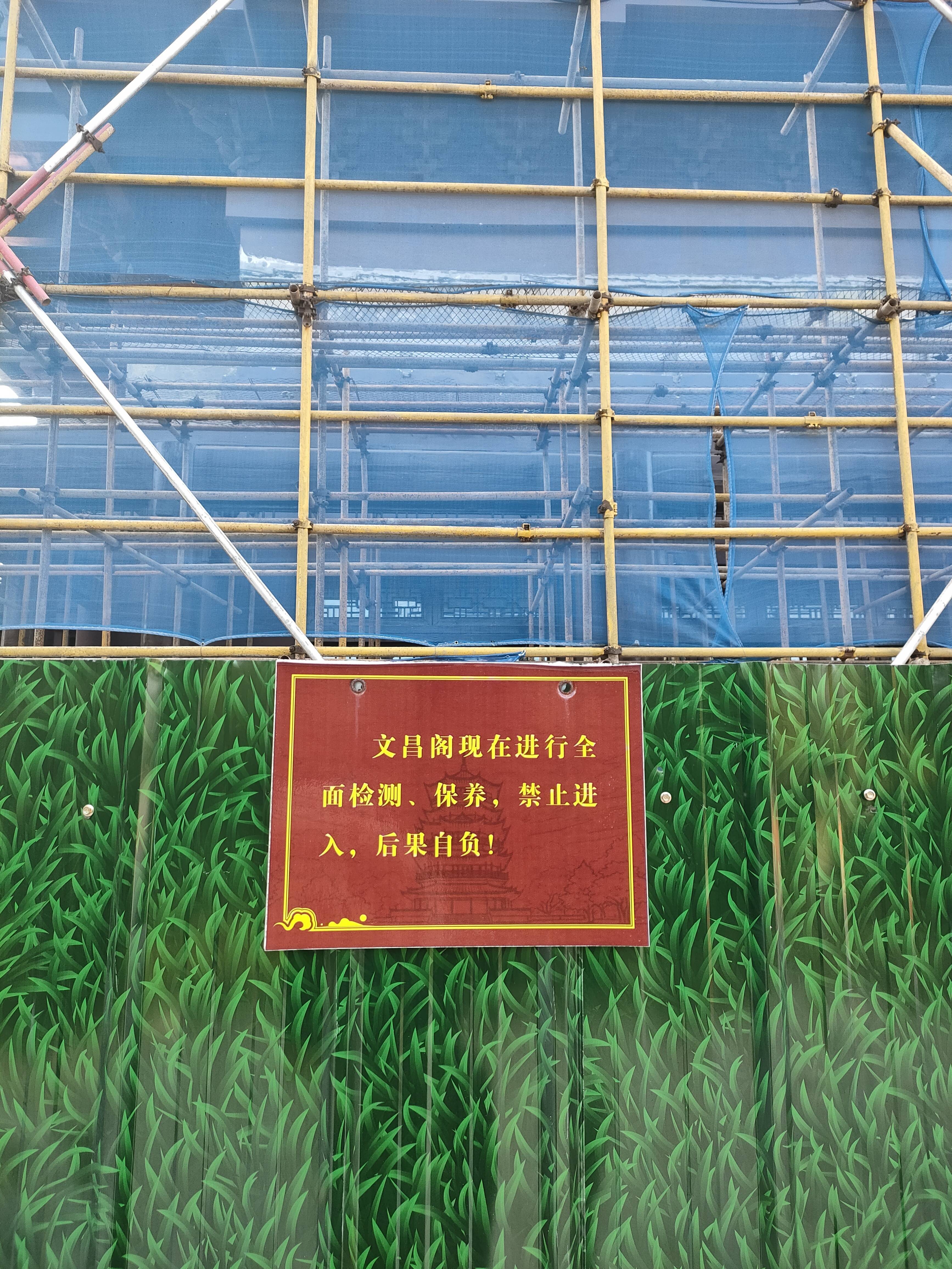 r立冬刚过,11月11日上午,大皖新闻记者来到巢湖市卧牛山公园,看到文昌阁基座四周围着围挡,基座下的空间里堆着多根木料,二、三楼外立面围着脚手架和防护网,围挡上挂着牌子,写有“文昌阁现在进行全面检测、保养,禁止进入,后果自负!”等字样,但现场并未看到维修人员。